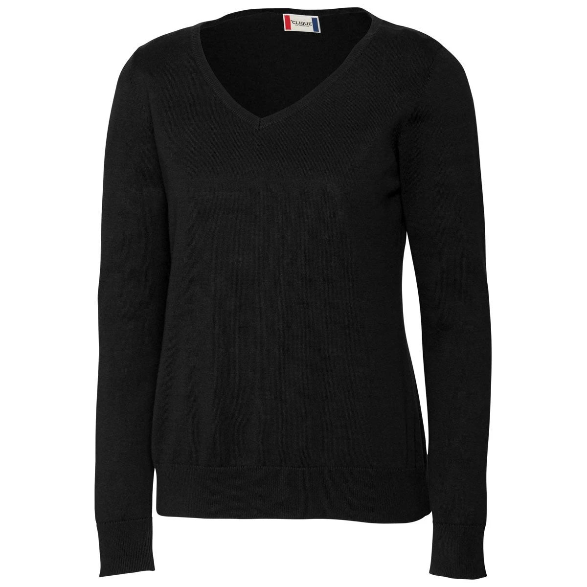 With a stylish v-neck design, the attention grabbing Clique Women’s Black Imatra V-neck Pullover is the perfect company apparel to wear while moving through crowded airport terminals. Add your corporate logo on the large embroidery area to turn the attention paid to the elegantly designed pullover to the products and services offered by your company. The 100% cotton v-neck pullover feels smooth enough against the body to eliminate the need to add an inner tee for layering. Ribbed hem and cuffs add panache to the fully fashioned pullover. The feminine fit will make you the fashion standout at the next civic event.