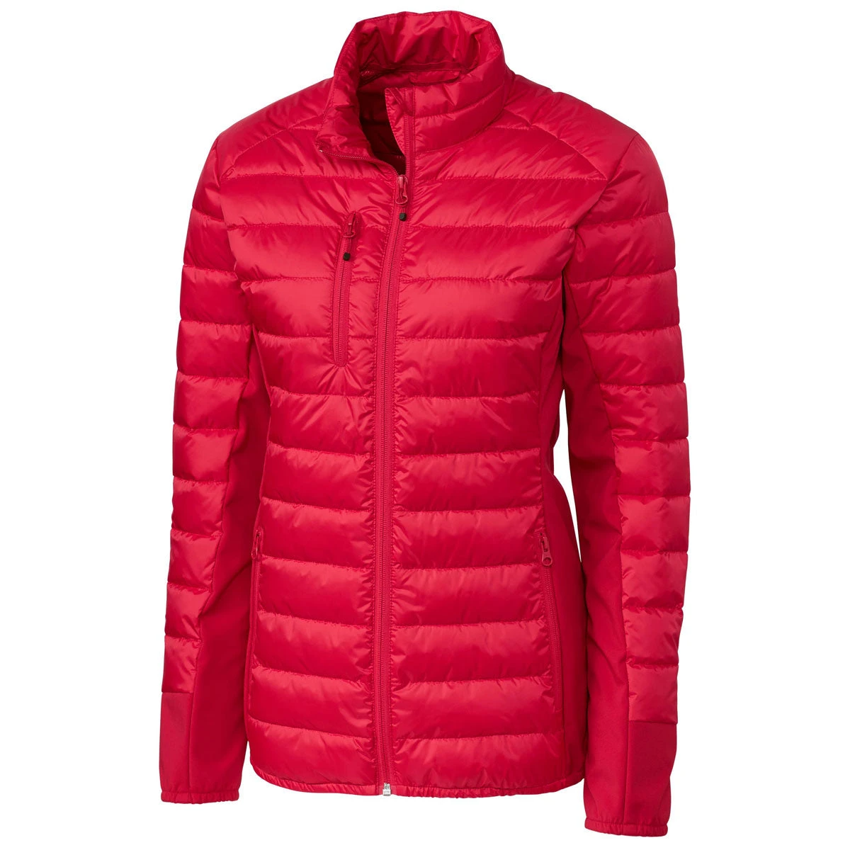 - 100% Polyester Quilted hybrid with colorblock softshell side panels